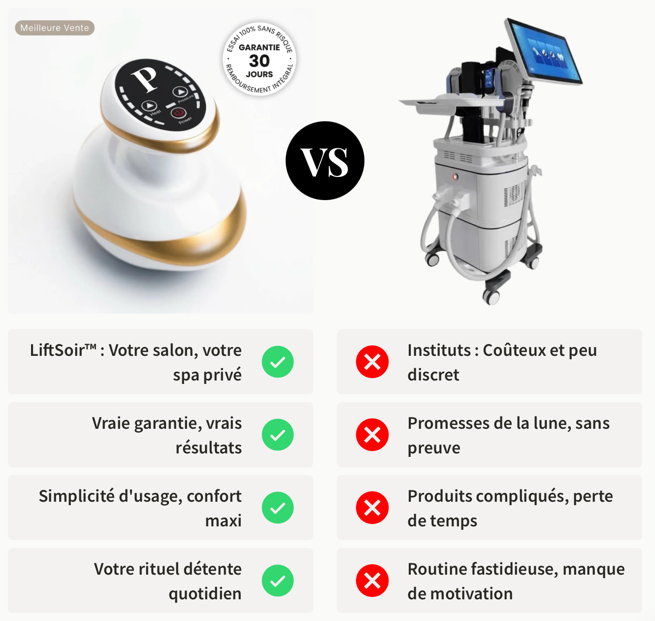 Fini les promesses vides, bonjour l'efficacité à domicile. Avec Liftsoir, traitez efficacement la cellulite à domicile. Économisez du temps et de l'argent en évitant les traitements coûteux et obtenez des résultats professionnels dans le confort de votre foyer.